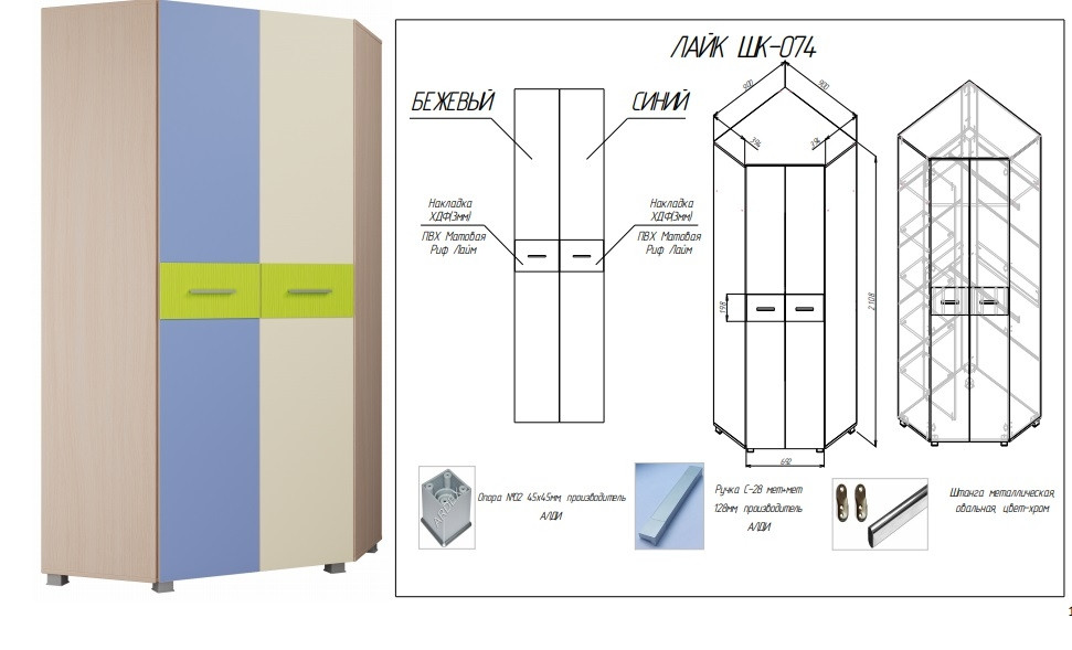• Шкаф угловой состоит из антресольной ниши, секцией с полками и секцией с 2мя штангами, данные секции универсальные, могут располагаться с любой стороны, для этого необходимо выбрать расположение отверстий под перегородку на верхней скошенной вязке и нижней крышке.